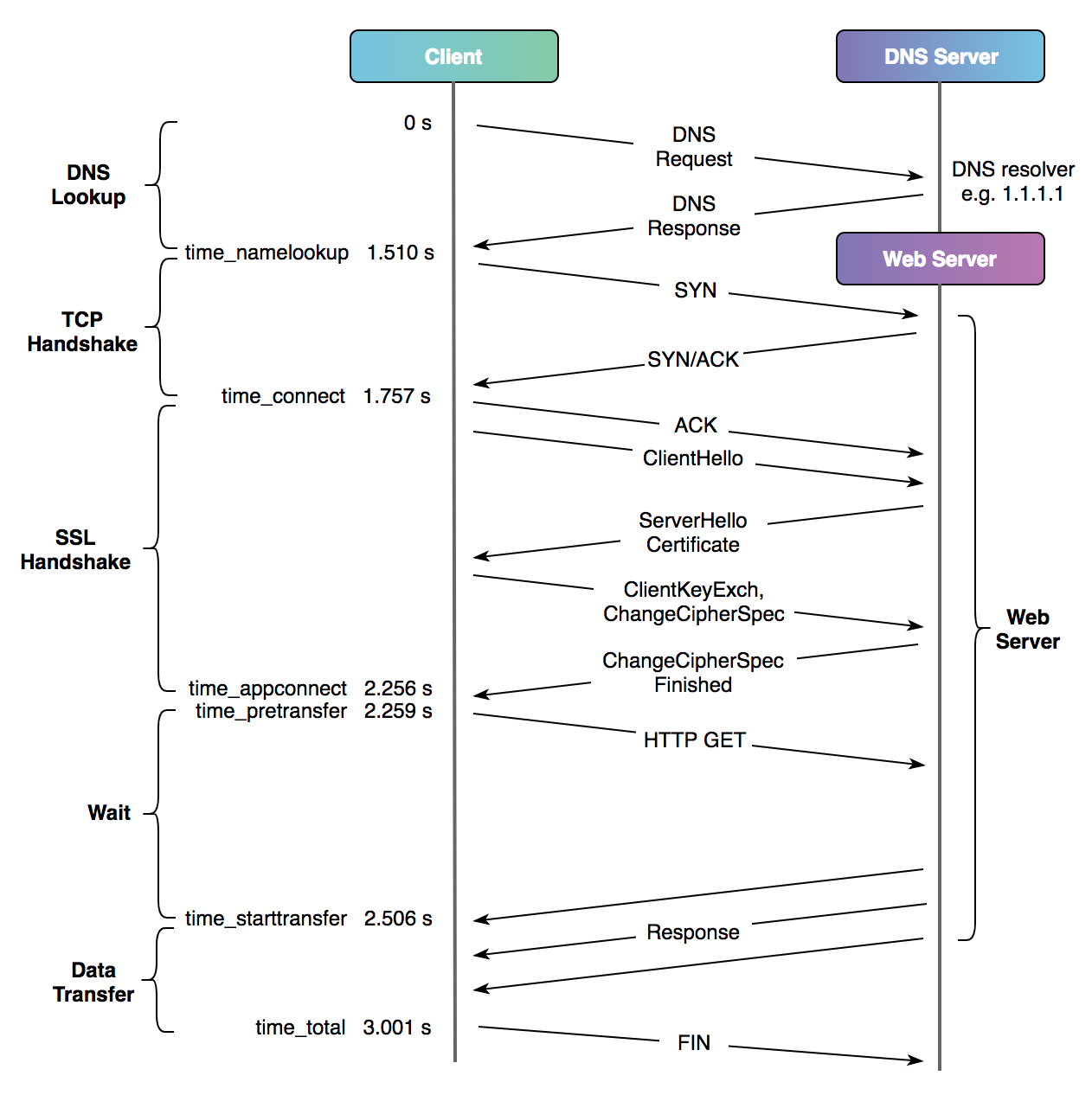 一个完整、无任何缓存、未复用连接的 HTTPS 请求需要经过以下几个阶段:DNS 域名解析、TCP 握手、SSL 握手、服务器处理、内容传输。