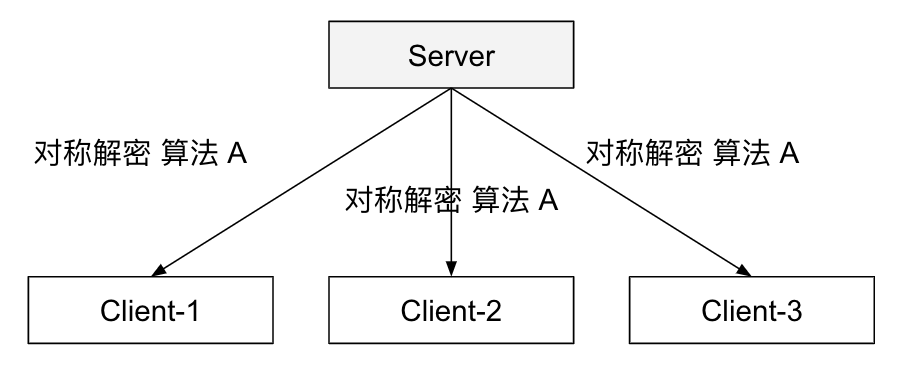 如图,如果是一个 1 v 1 的通信模型,想实现信息传递安全性,使用对称加密就可以。只要保证密钥不被第三者知道,信息传递的安全问题就能解决!