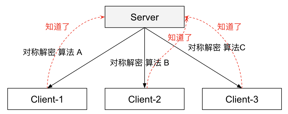 为了解决秘钥暴露的问题,我们使每个客户端使用不同的算法/密钥,并再增加一个协商的过程,用于确定双方采用哪一种加密算法/密钥(这个协商的过程就是 TLS 协议做的事情)