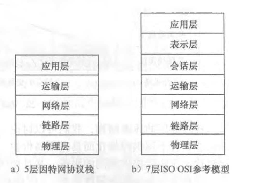 各层的所有协议被称为协议栈因特网的协议栈由 5个层次组成:物理层、链路层、网络层、运输层和应用层。