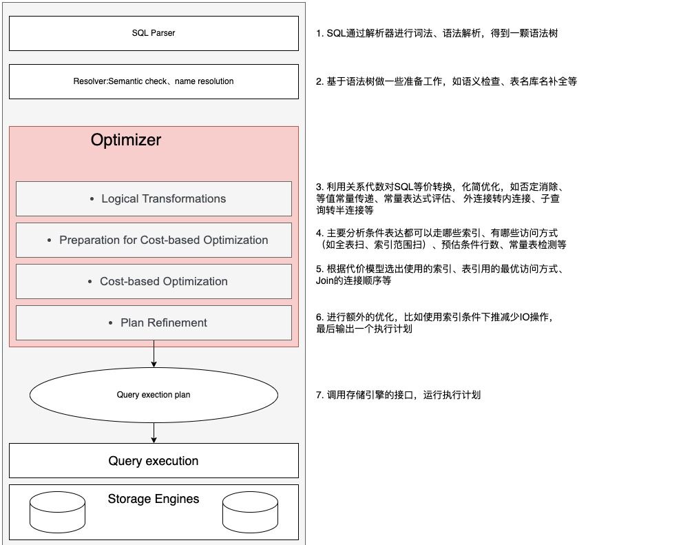 一条SQL在MySQL服务器中执行流程主要包含:SQL解析、基于语法树的准备工作、优化器的逻辑变化、优化器的代价准备工作、基于代价模型的优化、进行额外的优化和运行执行计划等部分。具体如下图所示: