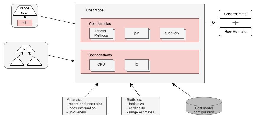 在MySQL 5.7中,这些操作代价的默认值都可以进行配置。为了计算出方案的总代价,还需要参考一些统计数据,如表数据量大小、元数据和索引信息等。MySQL的代价优化器模型整体如下图所示: