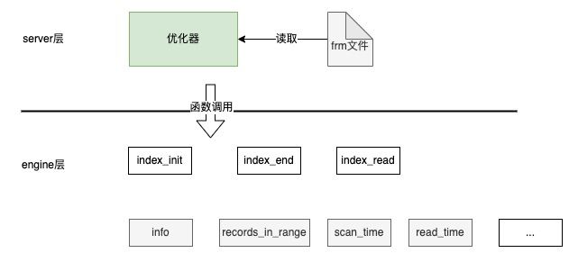 通过深入调研MySQL的代码结构和优化器流程,我们发现是可行的:一部分存在于Server层的frm文件中,比如索引定义;另一部分存在于Engine层中,或者通过调用Engine层的接口函数来获取,比如索引中某个列的不同值个数、索引占据的页面大小等。索引相关的信息,如下图所示:
