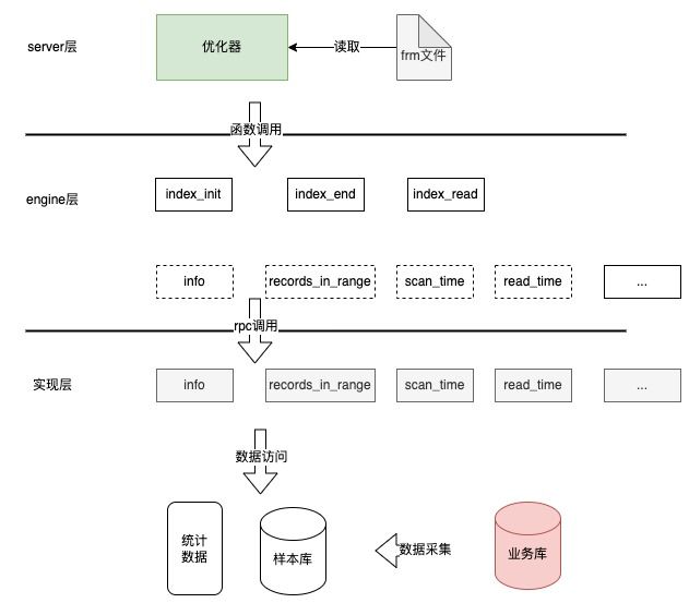 因为MySQL本身就支持自定义存储引擎,所以索引推荐思路是构建一个支持虚假索引的存储引擎,在它上面建立包含候选索引的空表,再采集样本数据,计算出统计数据提供给优化器,让优化器选出最优索引,整个调用关系如下图所示: