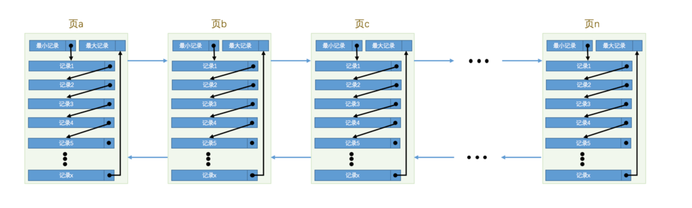 - 下一个数据页中用户记录的主键值必须大于上一个页中用户记录的主键值。
