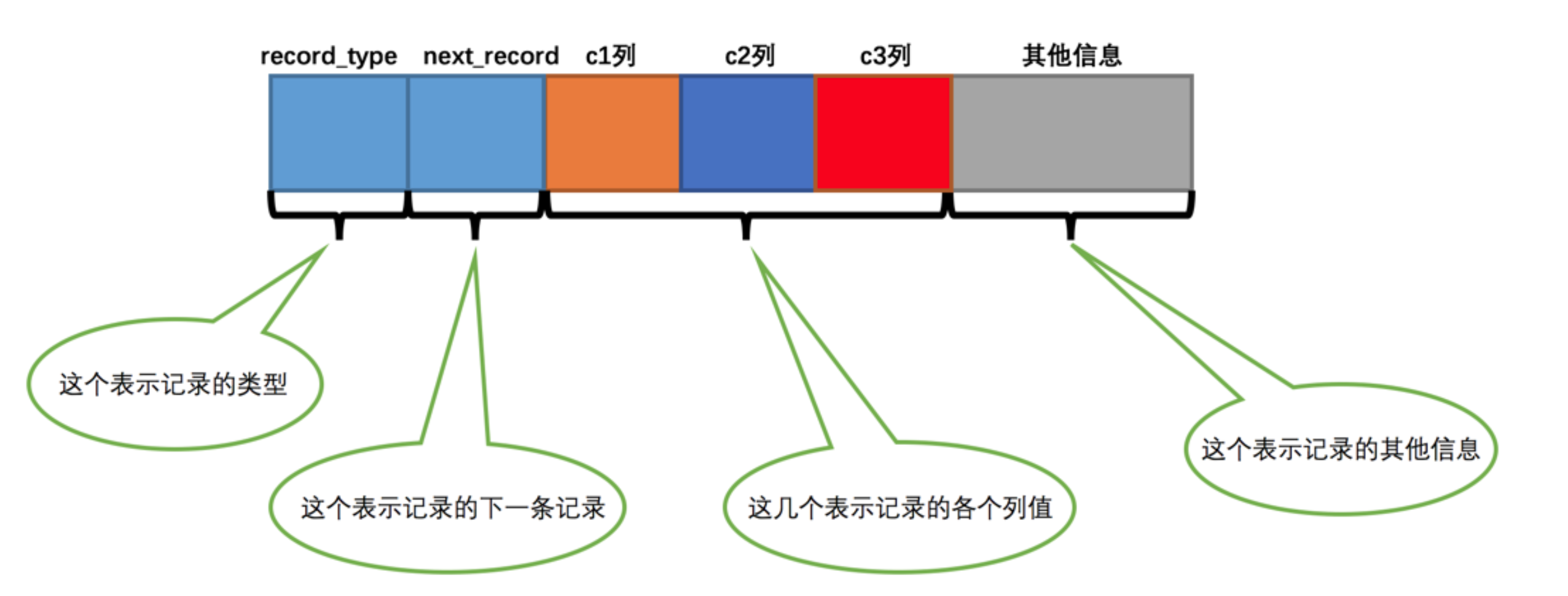 - 其他信息:除了上述3种信息以外的所有信息,包括其他隐藏列的值以及记录的额外信息。