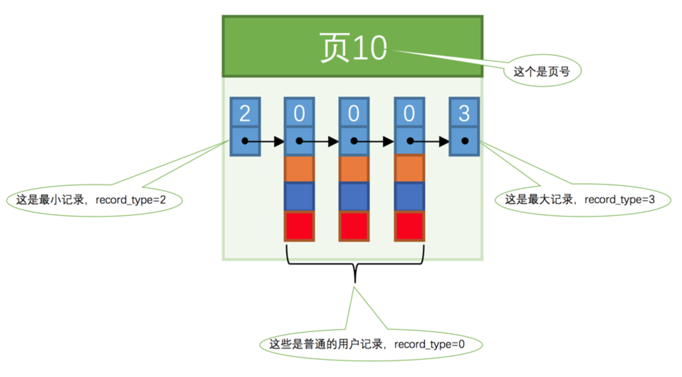- record_type:记录头信息的一项属性,表示记录的类型,0表示普通记录、2表示最小记录、3表示最大记录、1表示目录项记录。
