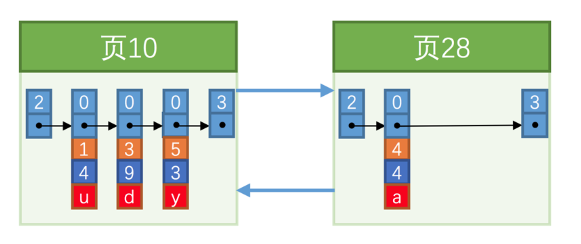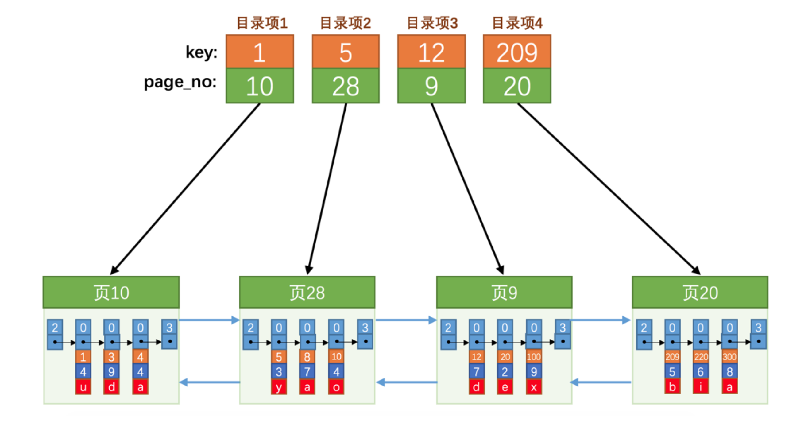 根据上面的示意图,现在假设页10最多只能放3条记录,如果已经存放3条纪录,此时我们再插入一条,我们不得不再分配一个新页: