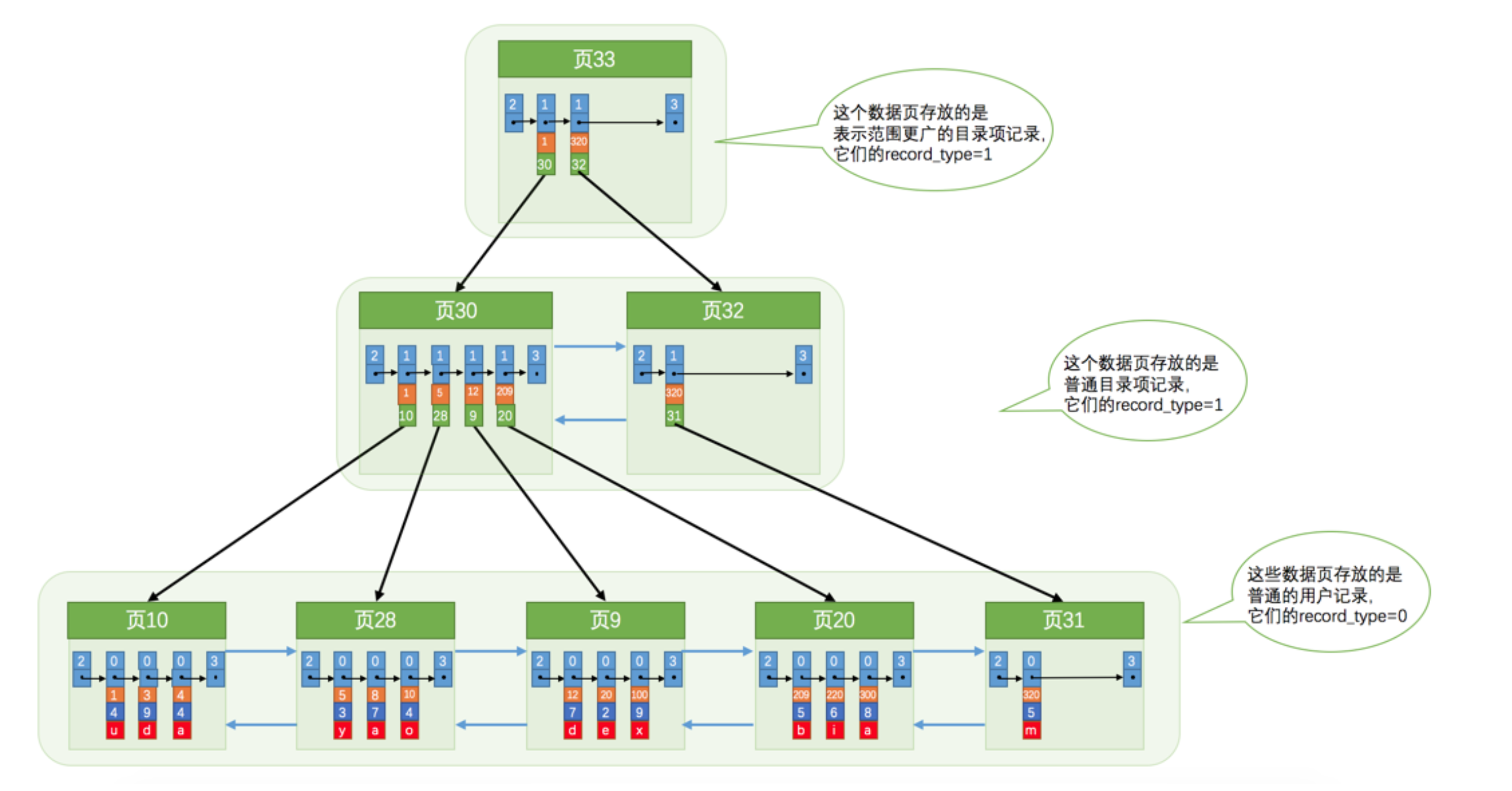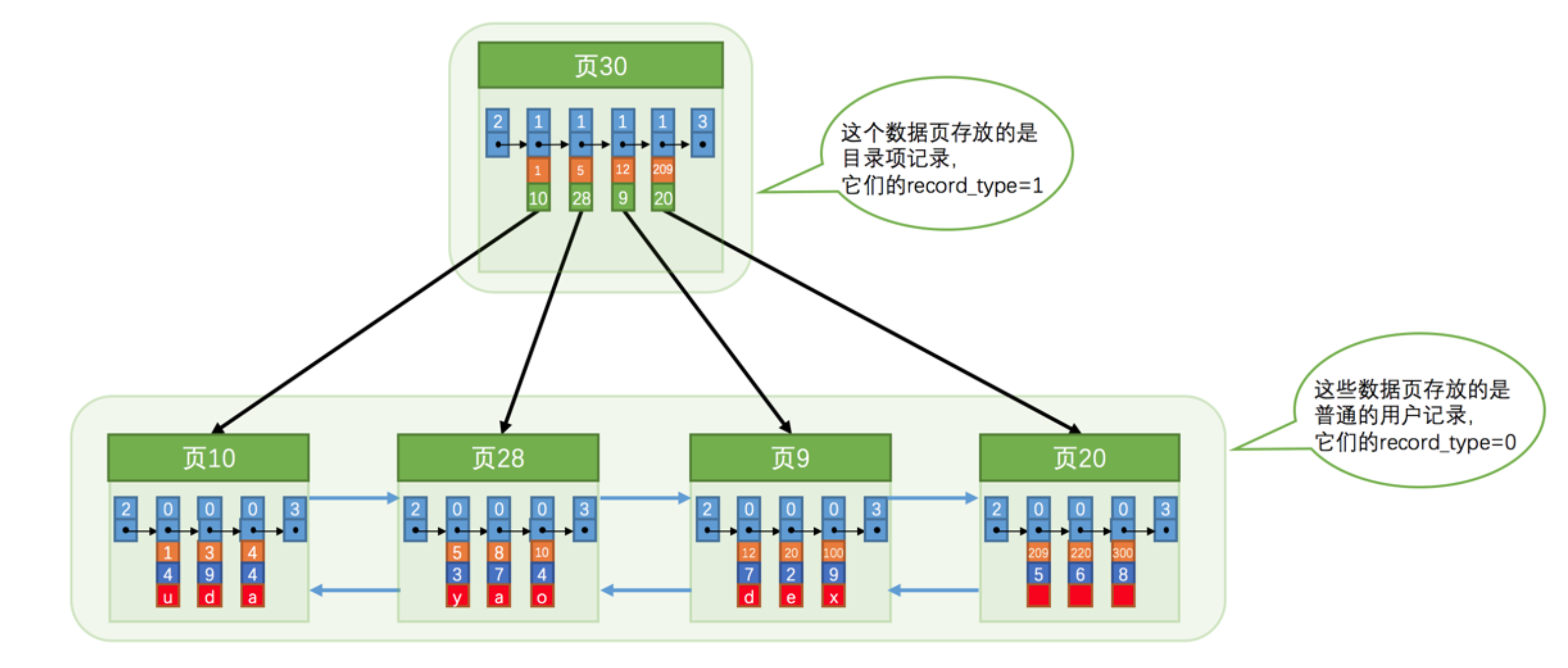 从图中可以看出来,我们新分配了一个编号为30的页来专门存储目录项记录。这里再次强调一遍目录项记录和普通的用户记录的不同点: