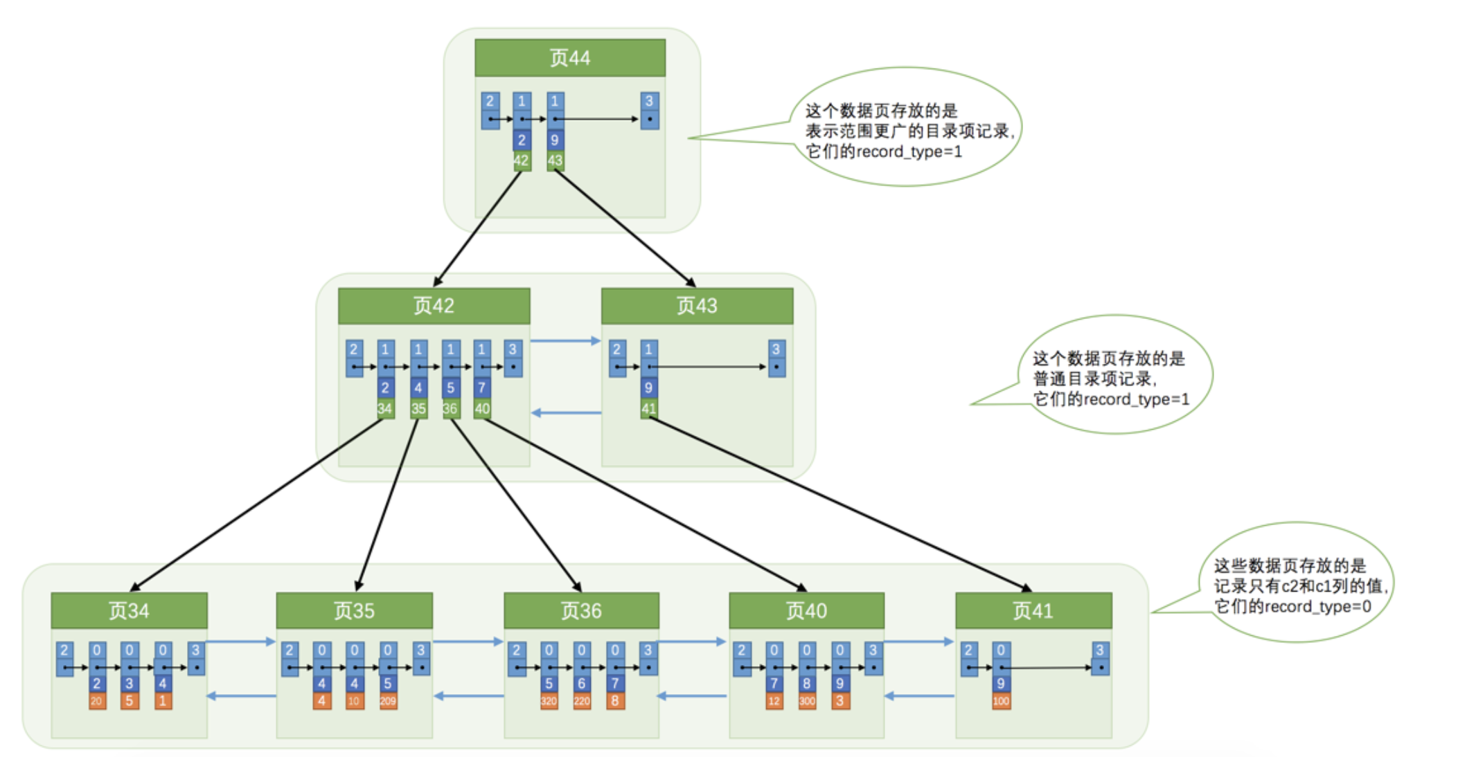 - 使用记录c2列的大小进行记录和页的排序,这包括三个方面的含义: