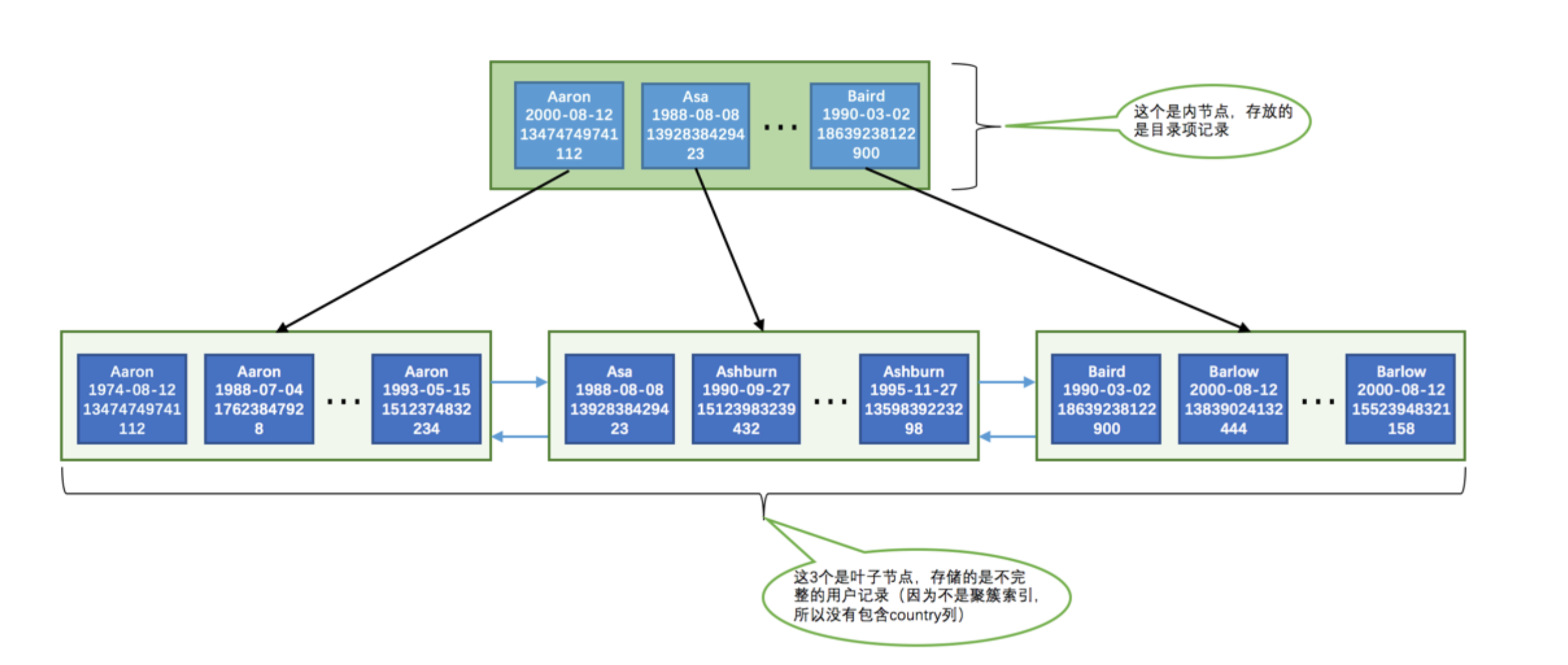 这个B+树与上面介绍的聚簇索引有几处不同: