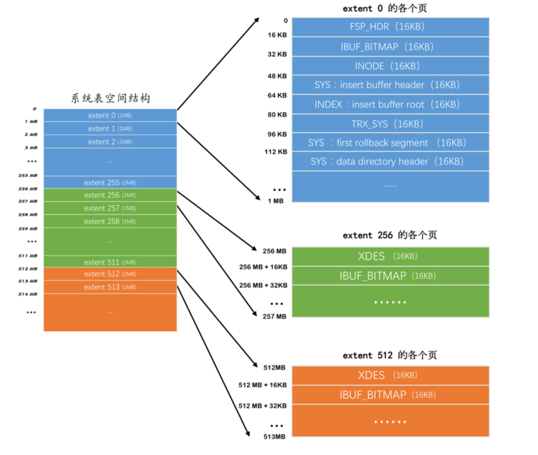 除了这几个记录系统属性的页之外,系统表空间的extent 1和extent 2这两个区,也就是页号从64~191这128个页被称为Doublewrite buffer,也就是双写缓冲区。