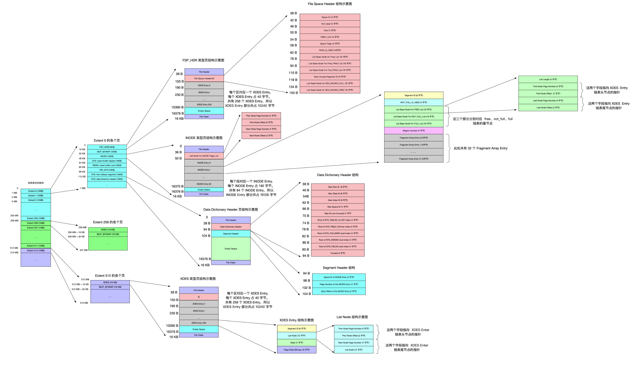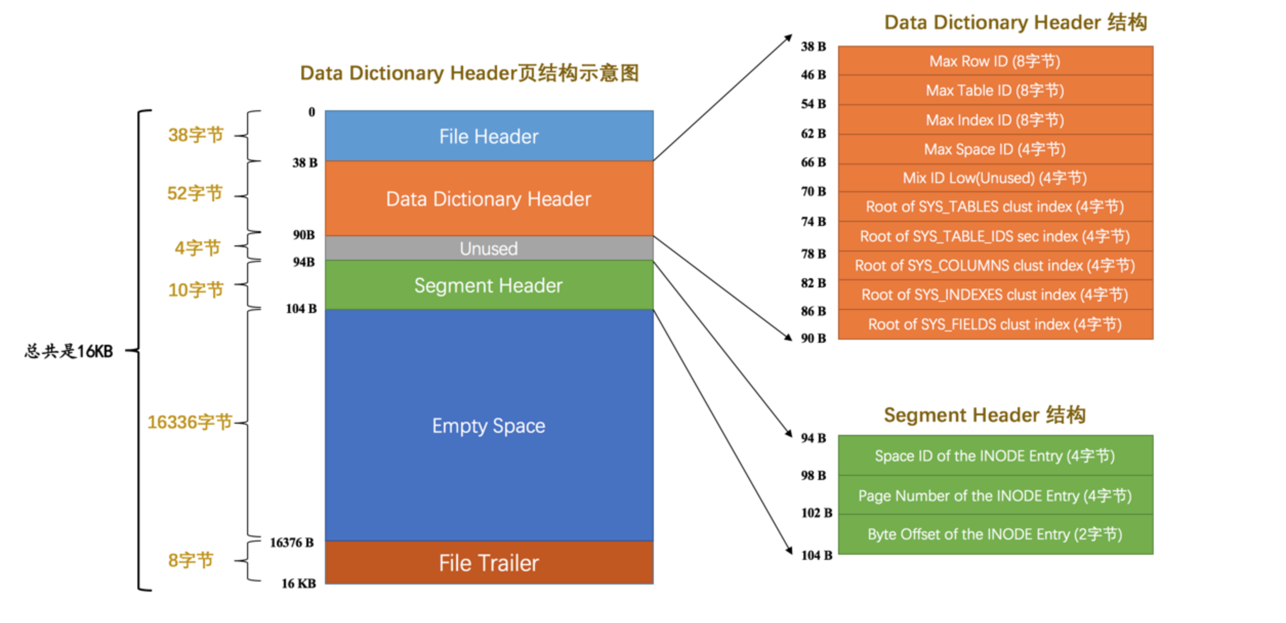 | Data Dictionary Header | 数据字典头部信息 | 56字节 | 记录一些基本系统表的根页位置以及InnoDB存储引擎的一些全局信息 |