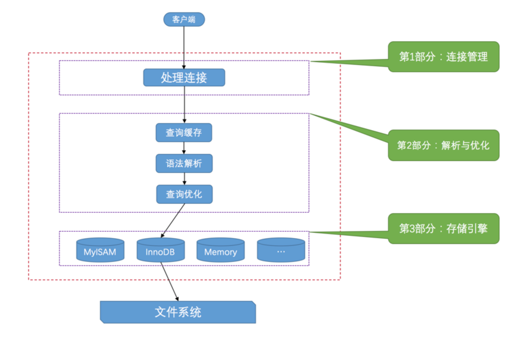 服务器程序处理来自客户端的查询请求大致需要经过三个部分,分别是连接管理、解析与优化、存储引擎。