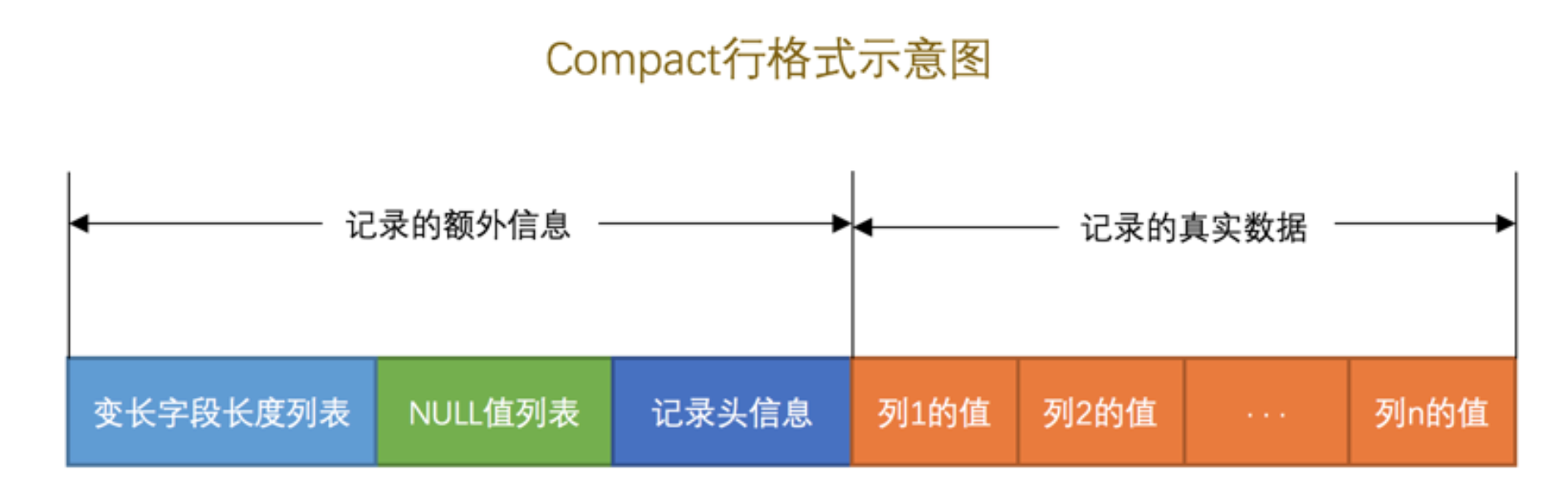 在Compact行格式中,把所有变长字段的真实数据占用的字节长度都存放在记录的开头部位,从而形成一个变长字段长度列表,各变长字段数据占用的字节数按照列的顺序逆序存放,我们再次强调一遍,是逆序存放!