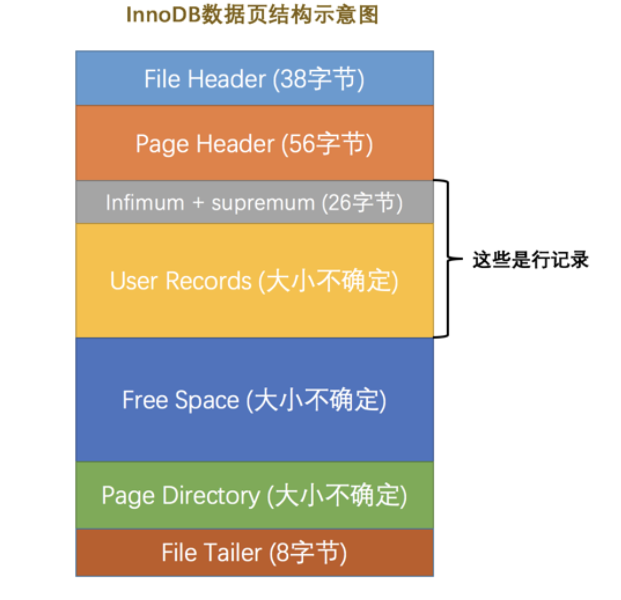 File Trailer:用于检验页是否完整的部分,占用固定的8个字节。 - 每个记录的头信息中都有一个next_record属性,从而使页中的所有记录串联成一个单链表。