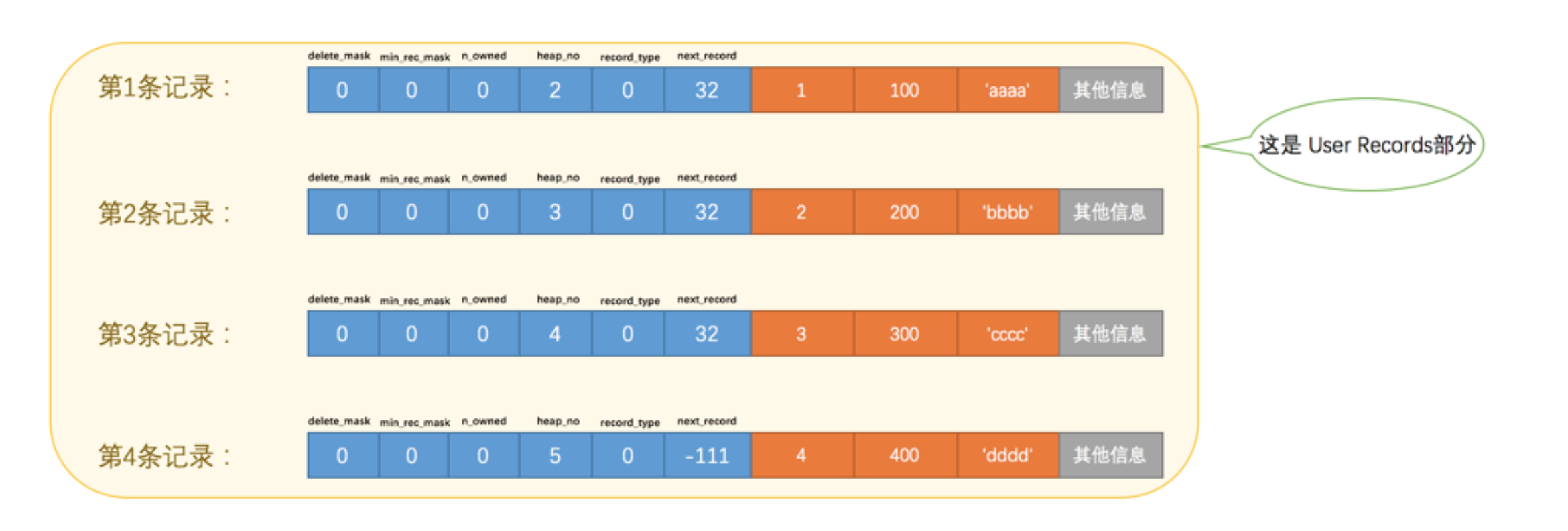 它表示从当前记录的真实数据到下一条记录的真实数据的地址偏移量。比方说第一条记录的next_record值为32,意味着从第一条记录的真实数据的地址处向后找32个字节便是下一条记录的真实数据。但是需要注意注意再注意的一点是,下一条记录指得并不是按照我们插入顺序的下一条记录,而是按照主键值由小到大的顺序的下一条记录。而且规定 Infimum记录(也就是最小记录) 的下一条记录就是本页中主键值最小的用户记录,而本页中主键值最大的用户记录的下一条记录就是 Supremum记录(也就是最大记录)
