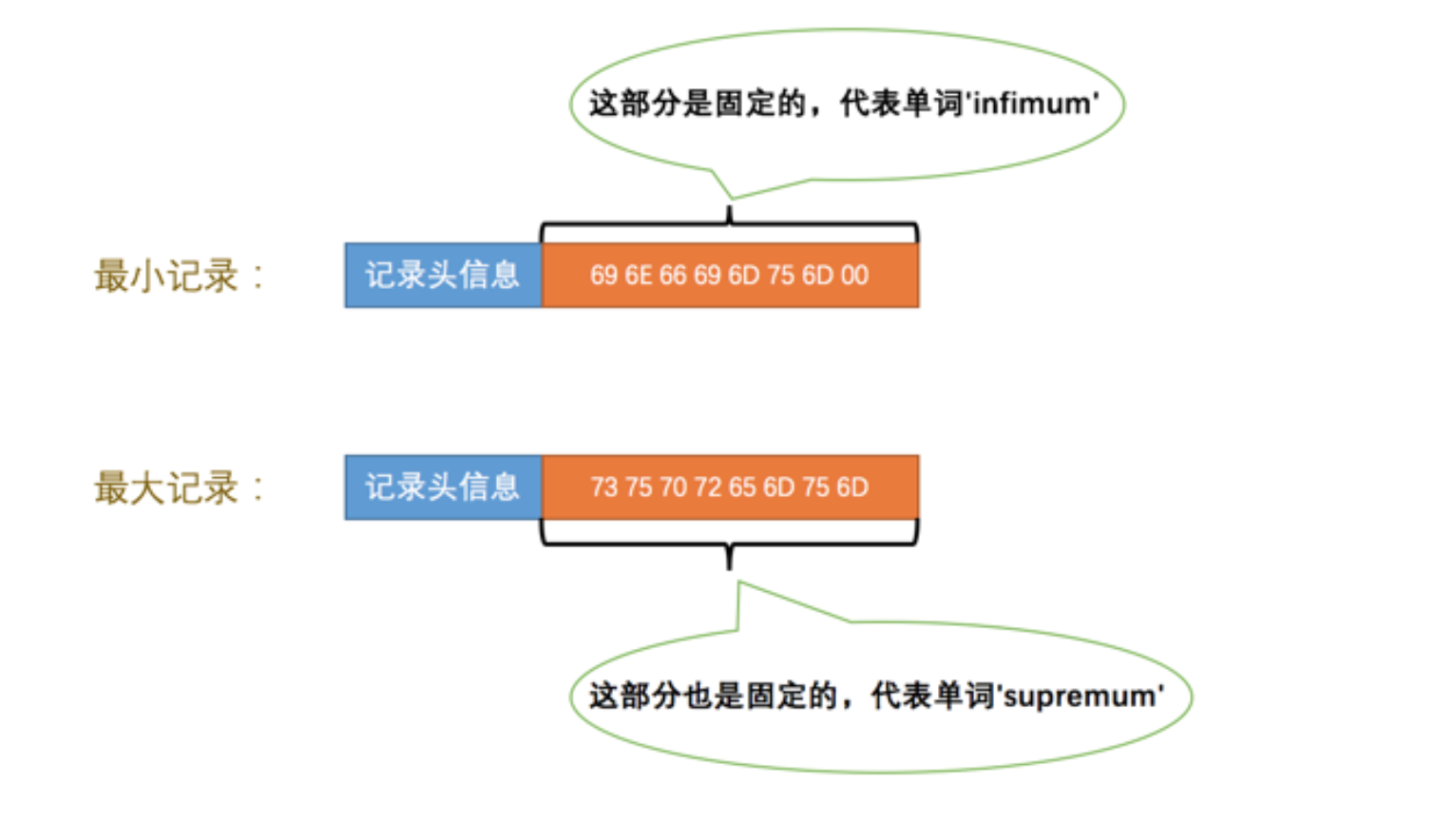 由于这两条记录不是我们自己定义的记录,所以它们并不存放在页的User Records部分,他们被单独放在一个称为Infimum + Supremum的部分。