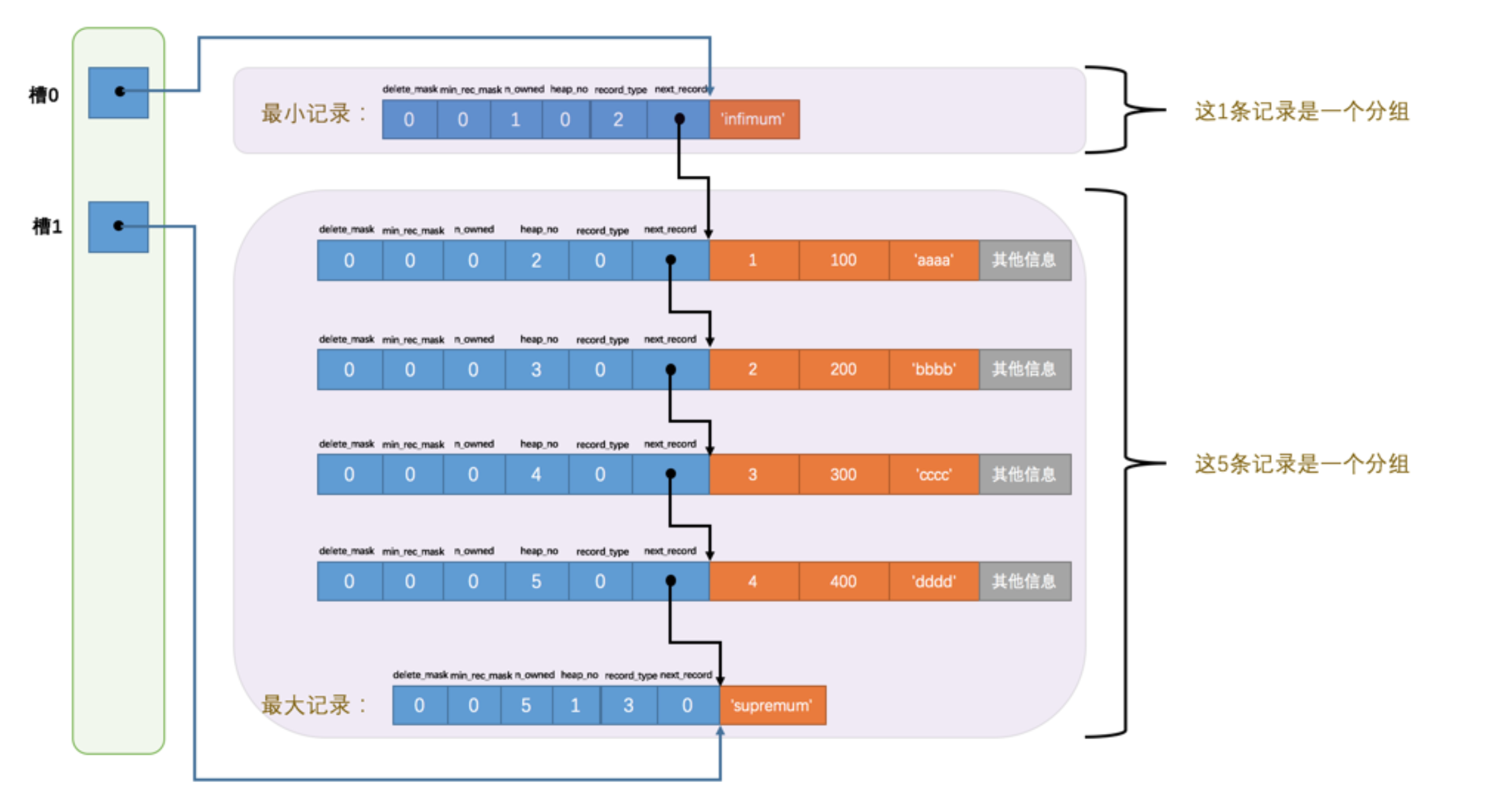 比方说现在的page_demo表中正常的记录共有6条,InnoDB会把它们分成两组,第一组中只有一个最小记录,第二组中是剩余的5条记录,看下面的示意图: