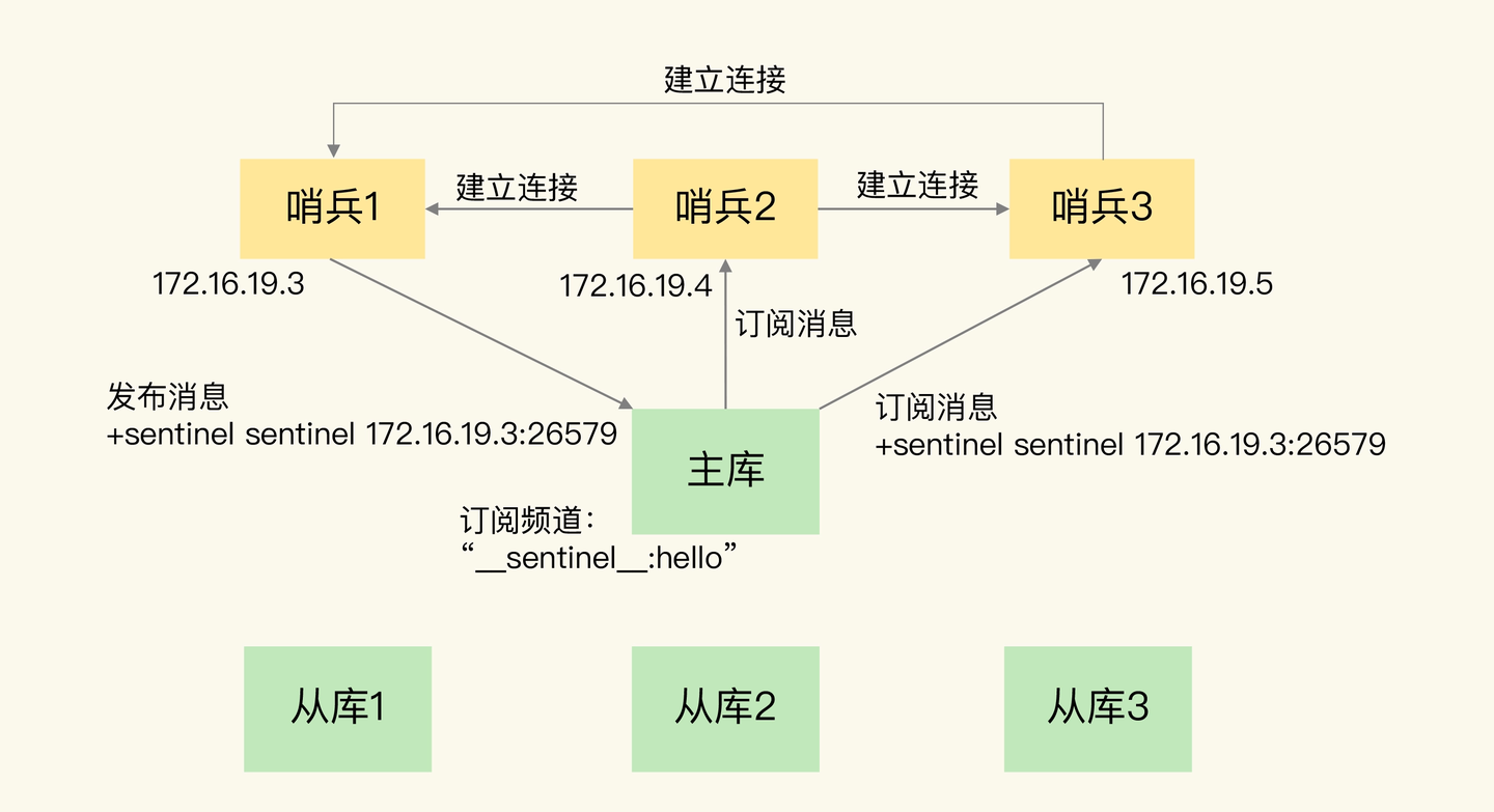 收集哨兵信息: 每个哨兵节点通过订阅__sentinel__:hello频道,收集到其他哨兵节点的信息。这使得每个哨兵节点都知道了集群中其他哨兵节点的存在。