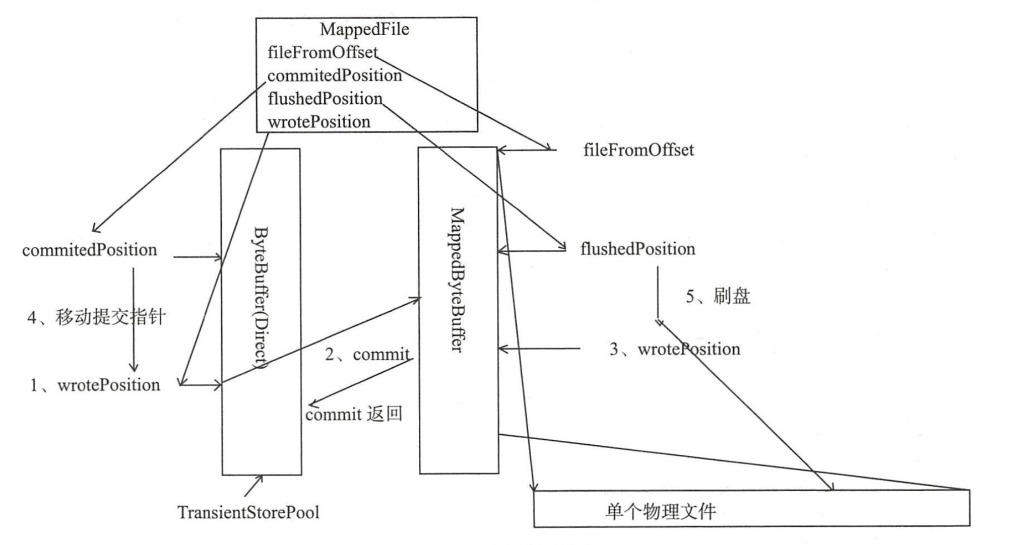 异步刷盘根据是否开启== transientStorePoolEnable ==机制,如果 transientStorePoolEnable 为 true, RocketMQ 会单独申请一个与目标物理文 件 ( commitlog) 同样大小的堆外内存, 该堆外内存将使用 内存锁定,确保不会被 置换到虚 拟内存中 去,消 息首先追加到堆外内存,然后提交到与物理文件的内存映射内存中,再 flush 到磁盘。如果 transientStorePoolEnable 为 flalse,消息直接追加到与物理文件直接映射的内存中,然后刷写到磁盘中。