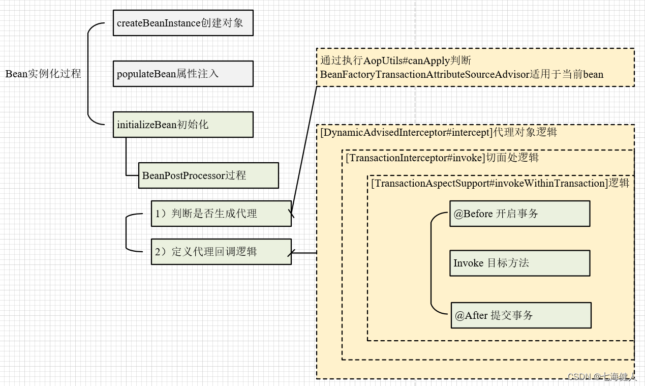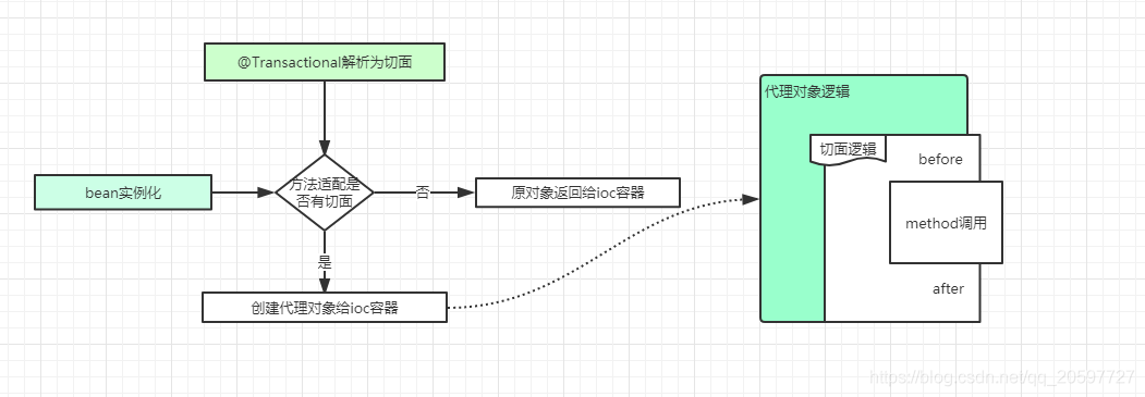 首先是@Transactional,作用是定义代理植入点。我们知道代理对象创建的通过BeanPostProcessor的实现类AnnotationAwareAspectJAutoProxyCreator的postProcessAfterInstantiation方法来实现个,如果需要进行代理,那么在这个方法就会返回一个代理对象给容器,同时判断植入点也是在这个方法中。