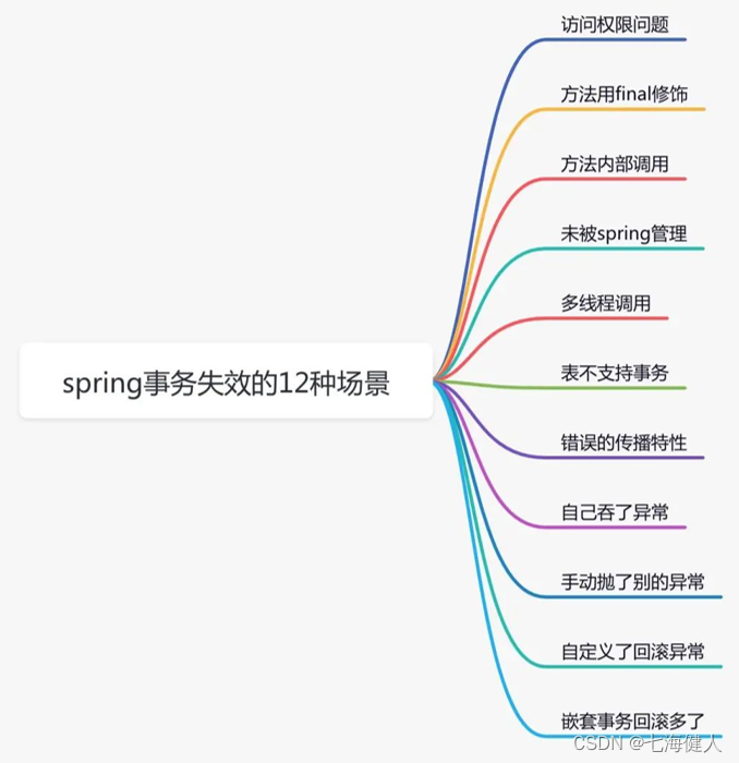 Java的访问权限主要有四种:private、default、protected、public;如果事务方法定义了错误的访问权限(非public方法),会导致事务失效。 - 目标方法用final修饰