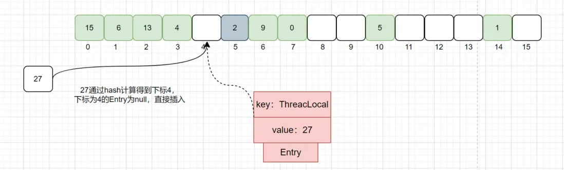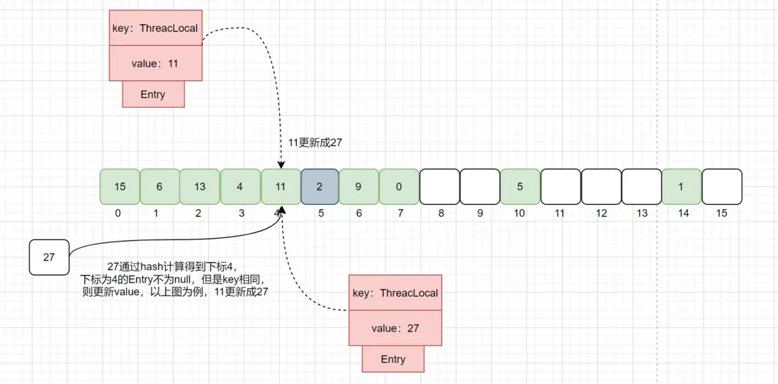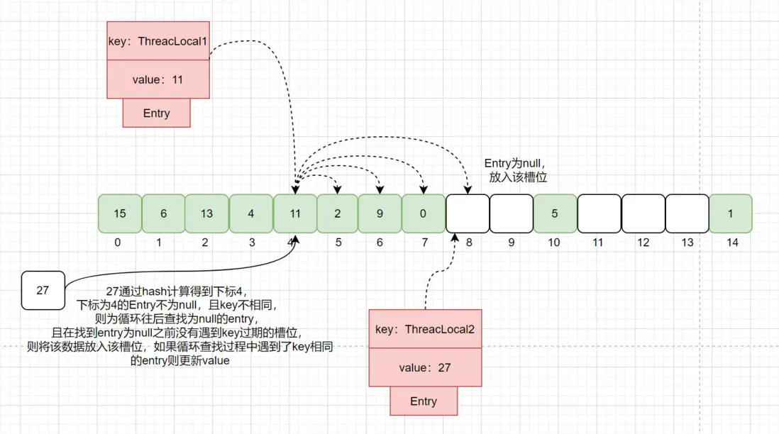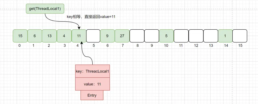 上图中比如get(ThreadLocal1)计算下标为4,且4存在Entry,且key相等,则直接返回value = 11。
