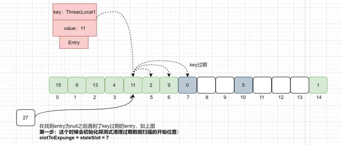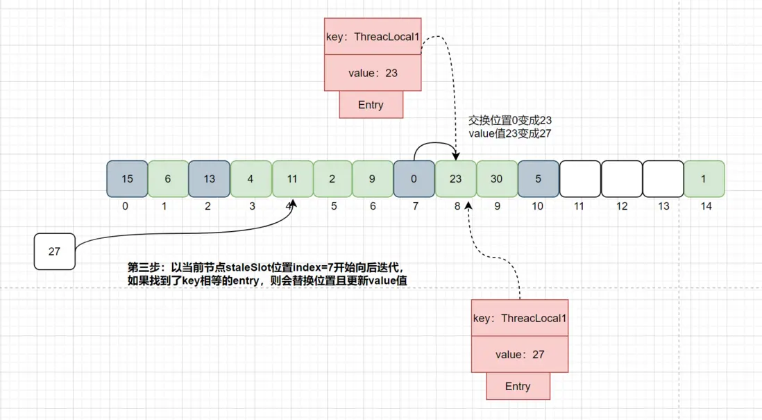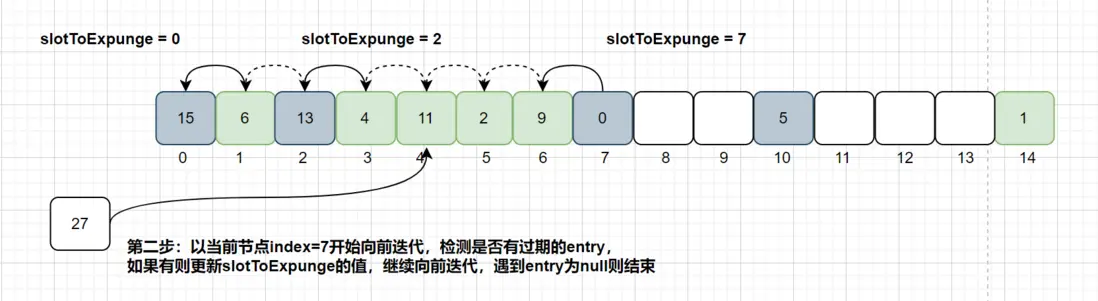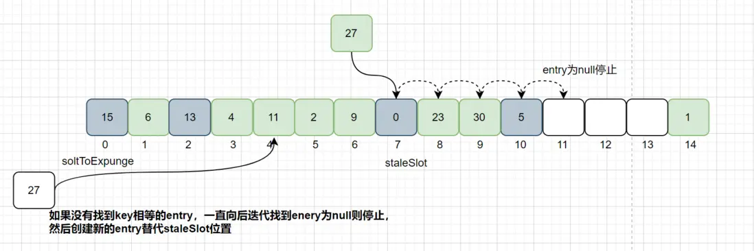 - 从散列表该下标开始往后查key相等的元素,如果找到则做清除操作,引用置为null,GC的时候key就会置为null,然后执行探测式清理处理。