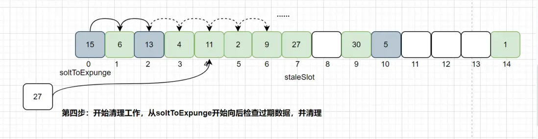 从i的下一个位置判断元素是否需要清除,如果遇到key==null的元素则会重置n,需要清除且更新i的值,判断且清除完毕之后,n = n >>> 1直到n = 0则退出清理。