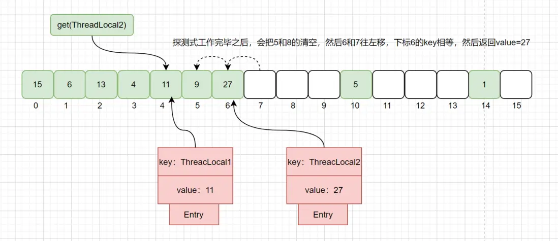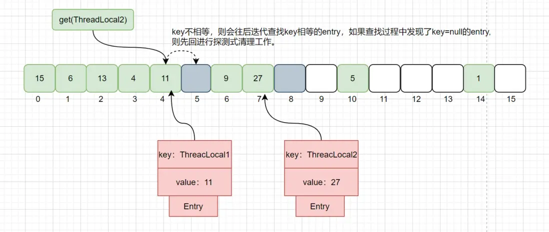 以get(ThreadLocal2)为例计算下标为4,且4存在Entry,但key相等,这个时候则为往后迭代寻找key相等的元素,如果寻找过程中发现了有key = null的元素则回进行探测式清理操作。如下图: