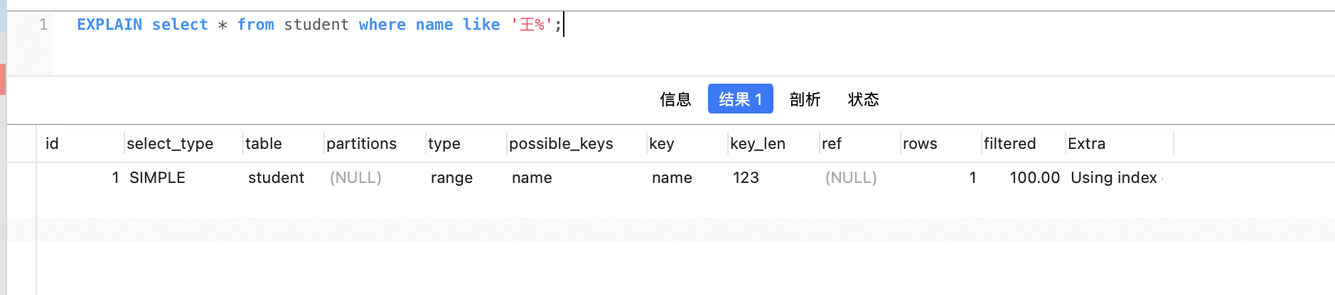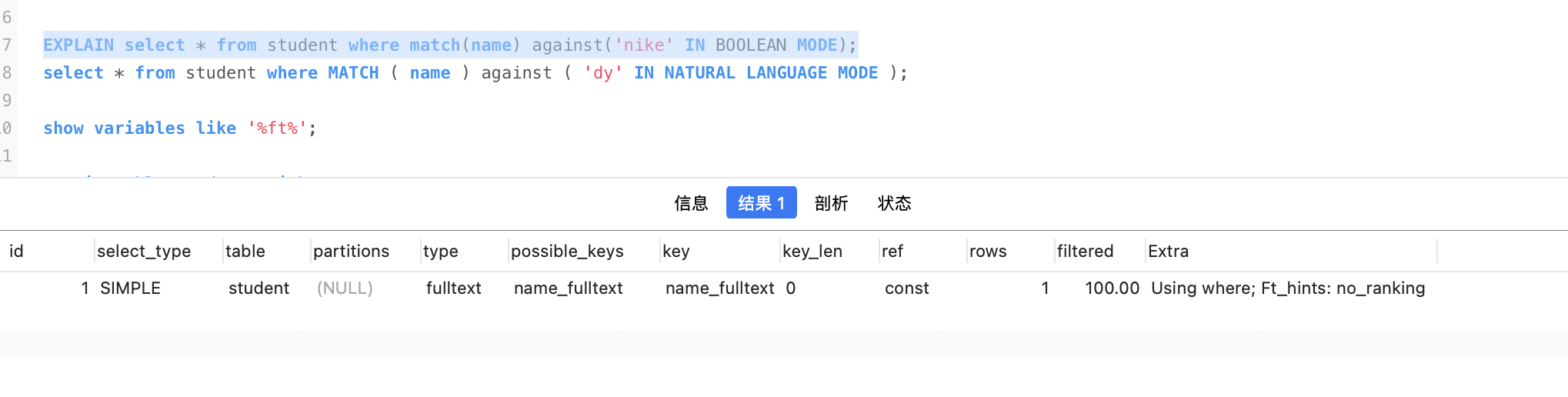 select * from student where MATCH ( name ) against ( '王' IN NATURAL LANGUAGE MODE );